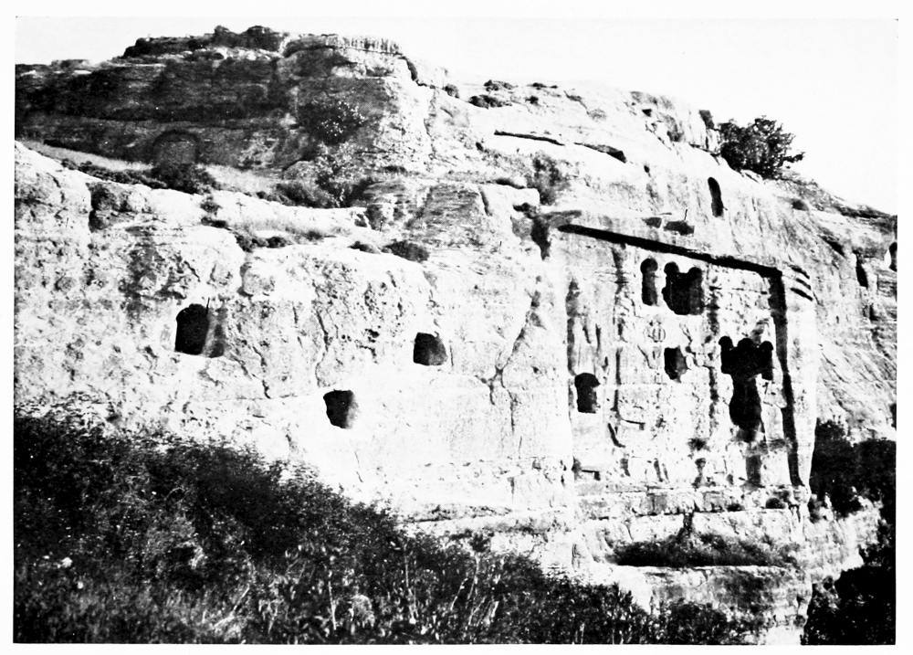 [183] The caves are carefully excavated and I should say that they are ancient. Layard (Nineveh and Babylon, p. 54) speaks of them as tombs and some may have been intended as burial-places, but I do not doubt that many were from all time used by the living. The troglodyte habits of the dwellers in these mountains are still strongly marked. Above Bâ’adrî I saw an underground village; at Ḥiṣn Keif, higher up the Tigris, the people live in rock-hewn chambers.