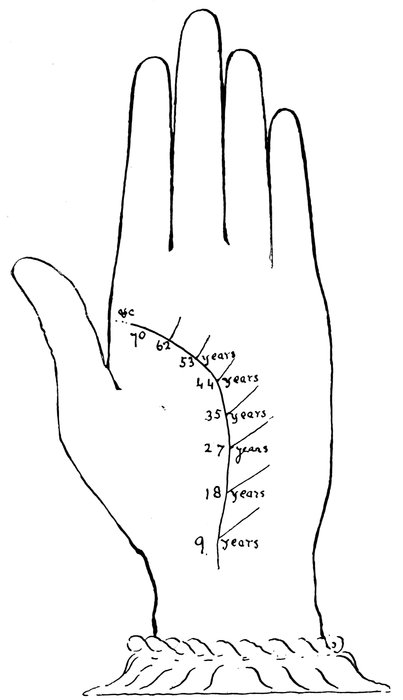 Interpretation.—When straight and not dissected by obscure little lines, denotes a healthy body; if extending only to the hollow of the hand, or short, it denotes a short life, or full of disease; the longer this line, the longer may the life be; if cut at end poverty in old age.