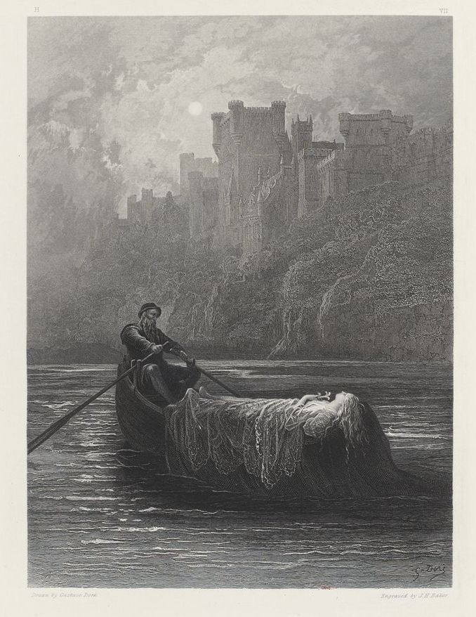 Mais lorsque le premier soleil monta à l'horizon, suivie des deux frères, qui marchaient lentement la tête baissée, la funèbre litière passa comme une ombre à travers la campagne en plein été, vers le ruisseau où se trouvait la barque drapée, dans toute sa longueur, du plus noir samit. Le vieux muet, le loyal serviteur qui avait toujours vécu dans la maison, se tenait sur le pont les yeux pleins de larmes et les traits contractés. Les deux frères enlevèrent de la litière le corps de leur sœur et le placèrent sur le noir tillac; ils mirent en sa main un lis, suspendirent sur elle le fourreau brodé d'armoiries, baisèrent son front tranquille et lui dirent: «Adieu, sœur, adieu pour toujours.» Ils répétèrent: «Adieu, chère sœur,» et partirent tout en larmes. Alors se leva le vieux serviteur muet, et la morte conduite par lui s'avança avec la marée, le lis dans sa main droite, la lettre dans sa main gauche, ses brillants cheveux dénoués et flottants. Toute la couverture était de drap d'or tiré jusqu'à sa ceinture, elle-même était tout en blanc, sauf la figure, et cette figure aux traits sereins était belle; car elle ne semblait pas morte, mais profondément endormie: on eût dit qu'elle souriait.