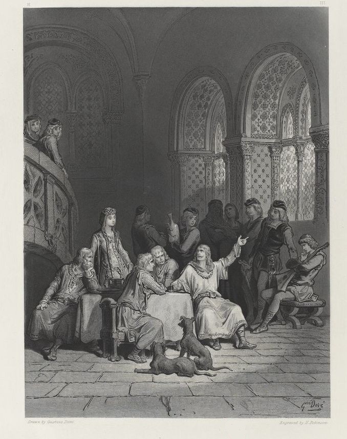 Alors le grand chevalier, le favori de la cour, l'amant de la plus aimable des femmes, entra dans cette salle rustique d'une façon toute gracieuse; non avec un demi-dédain dissimulé, comme dans un temps moins chevaleresque, mais en homme généreux parmi ses pairs. Ceux-ci le régalèrent de ce qu'ils avaient de mieux en mets et en vins, en y joignant la causerie et la musique des ménestrels. Ils s'informèrent beaucoup de la cour et de la Table ronde, et toujours Lancelot leur répondait nettement et sans hésiter; mais, lorsque la conversation tomba sur Genièvre, il se mit soudain à parler du muet. Il apprit du baron que dix ans auparavant, les païens s'étant emparés de lui, lui avaient coupé la langue: «Instruit de leur cruel dessein contre ma maison, dit le sire d'Astolat, ce serviteur m'en fit part; ils le prirent et le mutilèrent. Cependant moi, mes fils et ma petite fille, nous échappâmes à la captivité et à la mort, et nous nous réfugiâmes dans les bois, par la grande rivière, dans la hutte d'un batelier. Tristes étaient ces jours, jusqu'à ce que notre brave Arthur défit encore une fois les païens sur la colline de Badon.