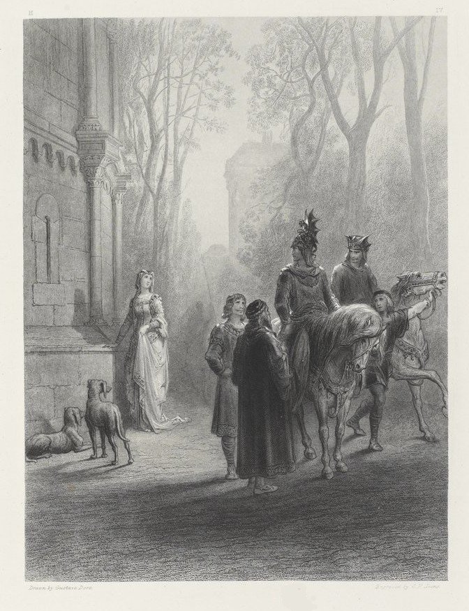 Sur-le-champ, messire Lancelot, en colère contre lui-même, monta à cheval. Ne voulant pas être reconnu, il quitta le chemin battu, prit un vert sentier qui ne montrait que rarement des traces de pas, et là, parmi les collines solitaires, souvent plongé dans la rêverie, il se perdit; jusqu'à ce qu'il suivit une ornière faiblement ombragée, qui, comme une chaîne, allait parmi les vallées aboutir au château d'Astolat. Là, il vit à l'ouest une lumière qui en annonçait au loin les tours sur une hauteur. Il se dirigea de ce côté et sonna du cor à l'entrée. Alors vint un vieillard muet, le visage couvert de rides, qui le conduisit dans une chambre et le désarma. Lancelot, étonné de voir cet homme silencieux, sortit et trouva le sire d'Astolat avec ses deux vigoureux fils, messire Torre et messire Lavaine, qui venaient à sa rencontre dans la cour du château, suivis d'une blanche créature, Élaine, la fille de la maison. Leur mère n'était plus. Il s'éleva parmi eux une légère plaisanterie mêlée d'un rire bientôt réprimé à l'approche du grand chevalier. A ce moment le sire d'Astolat lui adressa la parole: «D'où viens-tu, mon hôte, et de quel nom t'appelle-t-on? car, par ton port et ta présence, je pourrais deviner en toi le chef de ceux qui, après le roi, prennent place à la Table d'Arthur. Je l'ai vu, lui; quant aux autres chevaliers de sa Table ronde, quelque fameux qu'ils soient, ils me sont inconnus.»