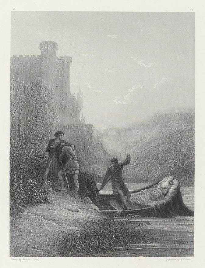 L'homme de Dieu étant venu et reparti, Élaine, la figure calme comme après le pardon des péchés, supplia Lavaine d'écrire, mot pour mot, une lettre qu'elle lui dicterait. Et lorsqu'il demanda: «Est-ce pour Lancelot? est-ce pour mon cher seigneur? je la porterai alors avec joie,» elle répliqua: «Pour Lancelot, la reine et le monde entier; mais il faut que je la porte moi-même.» Il écrivit alors la lettre sous sa dictée. Après qu'elle fut écrite et pliée: «O cher père, tendre et sincère, dit-elle, ne me refusez pas pour la première fois une fantaisie; quelque étrange qu'elle soit, c'est la dernière. Placez la lettre dans ma main un peu avant que je meure, et fermez ma main sur elle. Je la conserverai même dans la mort; et quand la chaleur aura abandonné mon cœur, alors prenez le petit lit sur lequel je serai morte: parez-le richement comme celui de la reine, ensevelissez-moi aussi comme elle dans ce que j'ai de plus précieux, et placez-moi sur cette couchette; qu'une litière soit toute prête pour me porter vers la rivière, ainsi qu'une barque drapée de noir. Je vais en cérémonie à la cour pour trouver la reine: alors sûrement je parlerai pour moi-même aussi bien qu'aucun de vous ne saurait le faire. Laissez donc notre vieux muet venir avec moi: il peut gouverner et ramer, il me guidera à la porte de ce palais.»