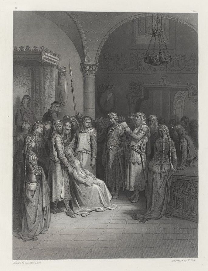 Pendant qu'ils causaient ainsi, le roi parut escorté par des chevaliers. Alors le muet, qui était tourné de profil, se montra de face et se leva; il indiqua du doigt la damoiselle et la porte. Arthur donna l'ordre au doux sire Perceval et au pur sire Galahad de lever la jeune fille; et ils la portèrent avec respect dans la salle du palais. A ce moment le beau Gauvain se présenta et s'émerveilla en la voyant. Plus tard vint Lancelot, et il rêva auprès d'elle; enfin la reine elle-même arriva et se sentit émue de pitié; mais Arthur apercevant la lettre dans la main de la jeune fille, se baissa, prit l'écrit, brisa le sceau et lut: ce fut tout.