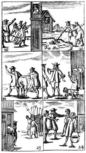 The next day, the Coach-man, after much inquiry, found out our Gentleman’s Quarters; and waiting his coming out, told him, that he had done him forty shillings worth of dammage in cutting the Leather of his Coach; he denied the fact, and bid him prove it: the other told him, that he would take his oath of it before any Justice of the Peace; and if (said he) you will not give me satisfaction, I will have you 287before a Justice, and he will compel you to do it. Our Gentleman hearing him talk so of the Justice, was resolved to frighten the Fellow, and out-wit him; and therefore he replyed, Nay, then, if you talk of a Justice, you were best have a care of your self, how you come there, lest I have you sent to New-gate. For what? replied the Coach-man. You need not make so strange of it, replyed our Gallant, you believe no body saw you yesterday what you did in the field near Putney, where you carried me? Why, what did I do? replyed the Coach-man. Why, you buggered a Sow there, replyed our Gentleman. Oh Lord! said the Coach-man. And oh Lady too! said our Gentleman, it is too true, and you will find it so to your cost; both my self, and my man saw it, and will take our Oaths of it if we go before the Justice. Our Gallants man hearing what his Master had said, justified and averred the truth with an Oath; which put the poor Coach-man into such a dump, that he went away with a flea in his ear, and durst not insist upon our Gentlemans payment for the dammage done to his Coach. This was the course our extravagant took; these were the tricks he plaid; and in general, there was no manner of mischief but he put in practice; and he so much prided, and gloried in doing so, that although it were well known he was wicked enough, yet he would not talk and boast of more than he had done; and there was no particular debauched action, or extravagancy done in London, but he would boast himself to be the Author of it, and imitate it to his power. He had observed, that a poor woman sat at one of the City-Gates, and sold hot pudding by the pound; he had a crotchet came in his 288Crown, to put a trick upon this Woman; and therefore having a Companion with him, he acquainted him with his intent, and desired his assistance. He who kept him Company was as ready as his Worship for any mischief; and therefore together they came to this poor woman, who was newly come with her pudding piping hot from the Bake-house, and demanded the price; she told them four pence a pound: he agreed to the price, and she weighed out a pound: she had asked him what he would do with it? for she, seeing his gaudy Clothes, and partly knowing him, said, that he would not eat it. He replied, it was no matter to her what he did with it, so long as she was paid for it. She knowing he had said true, delivered it to him in a handkerchif. He having the pudding, drew out a six pence, and throwing it on the ground, bid her take it up. She stooping so to do, his Companion turned up her Coats, and he clapt the hot pudding to her naked posteriors. The woman, feeling it hot, cryed out amain; but he still held it there, and pressed it hard upon her, whereupon she leapt away from them; and being sensible that she was scalded, she ran to the kennel, and taking up her coats, clapt her bare buttocks in the dirt, to cool and asswage the heat, whilst our Extravagant, and his Companion marched off.
