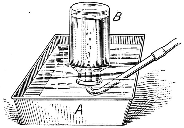 Test for Hydrogen.—Fill a small jar or wide mouthed bottle with hydrogen. This is done by 22first filling the bottle with water, inserting the end of the tube from the hydrogen generator, having first exhausted the air in the tube, then quickly inverting the bottle and placing the neck, Fig. 2, in a pan of water (A); the water will stay in the bottle. Now turn on the hydrogen. The gas, being lighter than water, will rise to the top of the bottle (B), drive out the water, and replace it with pure hydrogen, which should be free from air. Remove the bottle from the pan of water, keeping it inverted. Thrust a lighted splint into the bottle. The gas will light and burn at the mouth of the bottle. If the splint is thrust far into the bottle it will go out. Drops of water collect in the bottle. Burning is a union with oxygen; therefore, the burning of the hydrogen shows that it has an affinity for oxygen. The splint goes out because the hydrogen does not support combustion. If no air is allowed to get into it the gas cannot burn or explode.
