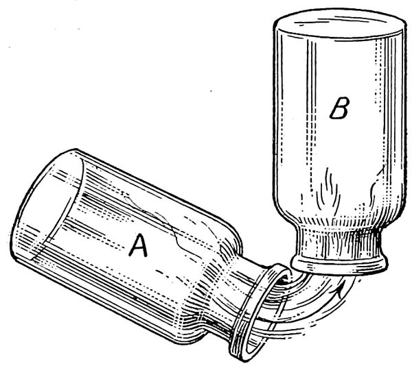 Proving That Hydrogen is Lighter Than Air.—Bring an inverted bottle of hydrogen close to an empty bottle, also inverted, Fig. 2. Gradually tip the bottle containing hydrogen (A) until it is brought to an upright position beneath the empty bottle. Test the bottles for hydrogen. The hydrogen will be found in the bottle (B) that was at first empty, proving that hydrogen is lighter than air, as it has risen in the empty bottle, displacing the air that was in it. If the bottle of 24hydrogen is left in an upright position without a cover for a few moments the gas will entirely disappear.