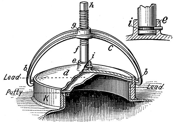 These goods can be readily purchased from dealers, with the exception of the charging and 27cleaning screws. They can be made in any brass foundry. The only difference between the charging and cleaning screws is the size. The charging screw, Fig. 5, should be at least 4 inches in diameter, or large enough to pass the hand through, while the cleaning screw should be 1¼ inches in diameter, or large enough to pass over a 1-inch pipe. A piece of sheet lead is fitted into the cover, as shown at a, to protect the metal from the acid. Soft putty is used for a packing, as shown in Fig. 5.