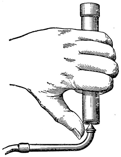Now, having noted these peculiarities, and knowing the perfect flame by sight, we will proceed to acquire the steady blast. The blow pipe should be held between the lips, which will form a tight packing around it, and must not come in contact with the teeth. The cheeks are then inflated, which will have a tendency to throw the tongue back to the throat and prevent the air in the mouth from blowing out through the nose. Now, by contracting the cheeks, and throwing the tongue slowly forward, the air will be forced through the blow pipe. This action is assisted when exhaling air by the pressure of the lungs, but when inhaling air the muscular contraction of the cheeks is depended upon entirely for the blast.