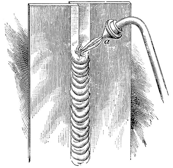 A screw and cap with a seat, such as is used on brass lamps, is obtained, and a hole punched in the cap c just large enough to receive the tube B. The screw is soldered into the opening of the can at D. The wick, which is formed of many strands of candle wicking rolled tightly together, is pulled through the tube by means of a wire hook, and left sufficiently long to lie in the space a, so that it will always lie in the alcohol. This tube is placed through the hole at D, and allowed to project about ¾ inch outside of the can. Wicking is then wound around the tube and forced into the socket formed in the screw D. The cap is then slipped over the tube at c, and screwed down tight on the wicking, which will make a 136tight joint at D, and will hold the tube firmly in place.