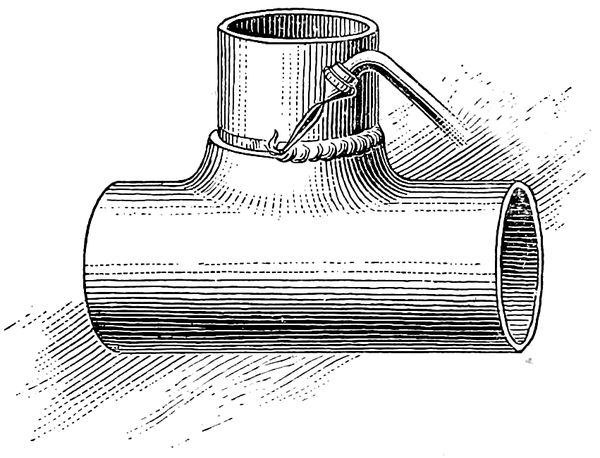 The common blow pipe is a simple little tool that is used in connection with an alcohol torch for soldering the finest and most delicate pieces of jewelry, and constitutes the sole method of soldering used by Britannia workers and jewelers, and the fact that such a varied assortment of articles are soldered by the blow pipe process leads one to surmise that it can be used to advantage on coarser work. Though it is a familiar tool to gas fitters, plumbers as a rule are ignorant of its use, and it is hard work to find one who ever saw a blow pipe used on lead work. It is an easy matter to become proficient in its use, and the trick of keeping up a steady blast, and breathing regularly at the same time, is soon learned, and, when once acquired, stays with you always. This trick consists of making a bellows of your cheeks and using your tongue as a valve to close the entrance to the throat, leaving the passage from the nostrils to the lungs clear for breathing purposes. The only things necessary 128to purchase for practice are a common bent blow pipe, which can be had for about 15 cents, and a common candle.