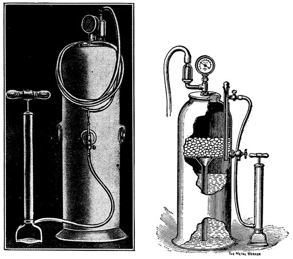 The gasometer style of air holder is the easiest to use, if one does not employ a helper and has a large amount of work to do. The pressure can be regulated to suit the work by placing one or more weights upon it until the desired pressure is obtained. It does not require pumping up more than three or four times a day, which is its principal virtue. It is a perfect shop apparatus. Its disadvantage is that it requires a large quantity of water to fill it, which is not always available, and when full it is so heavy that it requires a truck to move it around.