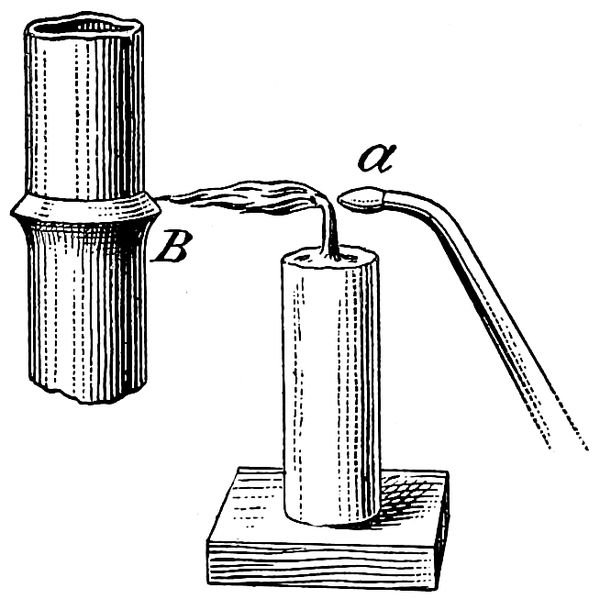To operate: The candle should be lighted, and when it burns well and freely the tip of the blow pipe should be brought close to the flame and slightly above the wick, a, Fig. 45. Then blow lightly through the blow pipe, and a pointed clear blue flame from 1 to 2 inches long, which will burn paper or char wood at a distance of 6 or 8 inches from the flame, will be the result. The flame is hottest and best when it shows a perfect cone-shaped blaze, and is obtained by a very moderate blast. The variation of the blaze can be noted by commencing to blow very lightly and increasing the pressure gradually. The flame 129will then show all stages from a smoky flame to a long blaze that cannot be concentrated on any small surface. The little sharp tip is where the hydrogen burns, and is the hottest part of the flame, being the part that is used for soldering.