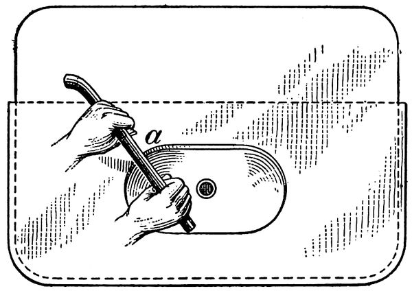 Britannia metal is fast becoming the favorite lining for splash and drip boards on butler's pantry sinks, as also for lining the work benches in saloons. It is soft enough to allow the most delicate china to be laid on it without danger of chipping, and is also very easy to keep clean. It takes a high polish and always looks well. The method of cutting the metal for a butler's pantry sink is shown in Fig. 51, the dotted lines showing the actual dimensions of the article to be covered, while the full lines show the laps required to cover the edges of the board. This metal is harder than lead, and will not dress smooth with the dresser. Any uneven spots must be pressed down with a hot flatiron. The method of turning the edges is shown at a. The bending iron is heated and rubbed over the edge, gradually turning 139the edges until they are at their proper position. The iron must be constantly heated to insure the best results, and if properly done no wrinkles will appear. A lined work bench is also shown in Fig. 52, which shows the method of putting in the bar washer. The sheet metal must be cut and fitted to its place and all the seams possible should be soldered before placing the metal in position. The edges should be tacked on the under side of the work, when practicable, with copper tacks.