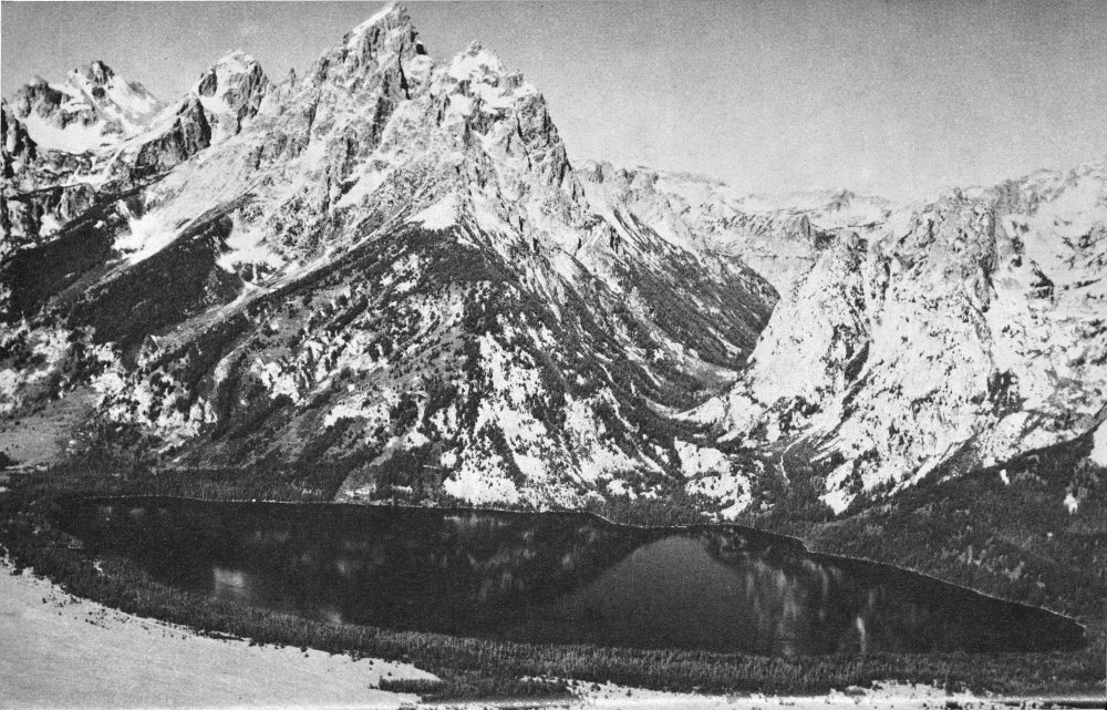 The Teton Range is one of the most magnificent mountain ranges on the North American Continent. Others are longer, wider, and higher, but few can rival the breath-taking alpine grandeur of the eastern front of the Tetons. Ridge after jagged ridge of naked rock soar upward into the western sky, culminating in the towering cluster of peaks to which the early French voyageurs gave the name “les Trois Tetons” (the three breasts). The range hangs like a great stone wave poised to break across the valley at its base. To the south and east are lesser mountains, interesting and scenic but lacking the magic appeal of the Tetons.