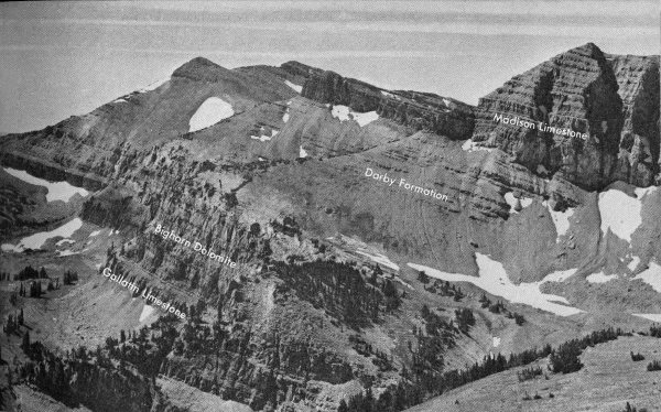 Conspicuous on the eastern and southeastern skyline are high-level (11,000-12,000 feet) flat-topped surfaces on both the Wind River and Absaroka Ranges. These are remnants that mark the upper limit of sedimentary fill of the basins adjacent to the mountains. A plain once connected these surfaces and extended westward at least as far as the conspicuous flat on the mountain south of Lower Gros Ventre Slide. It is difficult to imagine the amount of rock that has been washed away from between these remnants in comparatively recent geologic time, during and after the rise of the Teton Range.