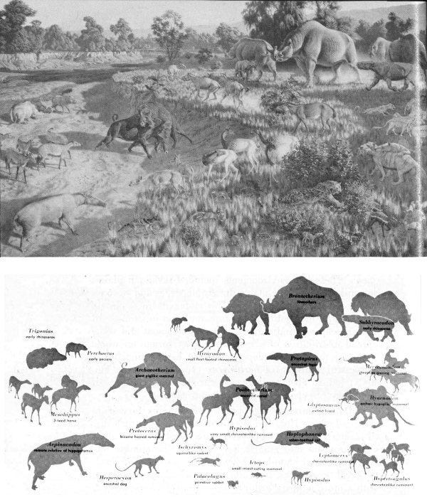 Figure 51. A typical Oligocene landscape showing some of the more abundant types of mammals. Mural painting by Jay H. Matterness; photo courtesy of Smithsonian Institution.