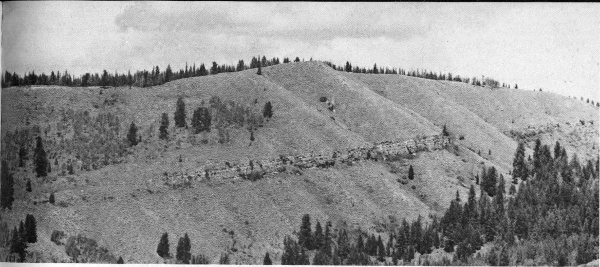 Figure 55. East face of Signal Mountain showing Bivouac Formation (upper Pliocene or Pleistocene). Tilted ledge is rhyolitic welded tuff 2.5 million years old, and slopes above and below it are conglomerate. National Park Service photo by W. E. Dilley.