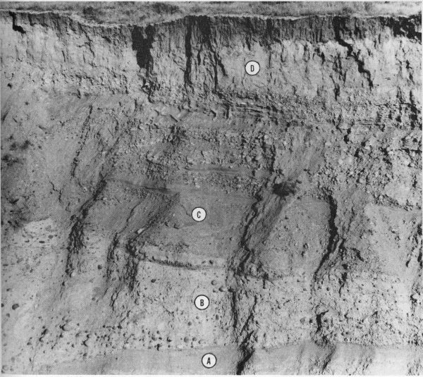 Figure 58. Glacial deposits, outwash, and loess exposed along Boyle Ditch in Jackson Hole National Elk Refuge. Indicated are middle Pliocene Teewinot formation (A), oldest till (B), Bull Lake outwash gravel (C), and post-Bull Lake loess (D), which here contains snail shells dated by Carbon-14 as 15,000 years old. Height of cliff is about 30 feet.
