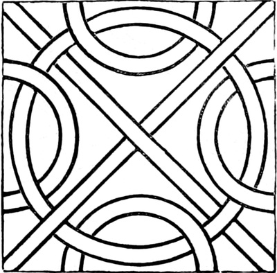 Der Stoff, womit die Kugel überzogen ist, erschien als so interessant, daß es wünschenswerth war, ihn, um das Muster vollständig zeichnen zu können, vom Holze abzulösen, da große Theile durch Falten verdeckt wurden. Dies wurde unlängst vorgenommen, und es zeigte sich nicht nur der Stoff, der hier abgebildet ist, in seinem schönen Muster, sondern auch, daß die daran geknüpfte Voraussetzung unrichtig war, und daß man, wenigstens bei Anfertigung des Gefäßes, dasselbe nicht als falschen Schädel anbringen wollte. Es fand sich, daß das Gefäß hohl gedreht ist und oben eine runde, durch einen passenden Deckel geschlossene Oeffnung hat. Das Innere ist nicht vollständig glatt, sondern zeigt die vom Ausdrehen entstandenen Ringe. An all diesen Ringen hafteten Spuren eines gelblichen, sandartigen Gegenstandes. Es zeigte sich auch, daß die Kapsel schon früher geöffnet war; denn der genau schließende Deckel war durch Ansetzen eines scharfen Instrumentes behufs, der Oeffnung etwas verletzt worden. Es dürfte also die Annahme gerechtfertigt sein, daß das Gefäß ehemals Erde von heiliger Stelle in sich barg, entweder aus dem heiligen Lande, oder von der Stätte, wo ein Märtyrer gelitten; möglich auch, daß sie auf den heiligen Jacobus Bezug hatte, in dessen Kirche die Kapsel, der, wie der Augenschein zeigt, viele Verehrung erwiesen worden war, sich befand.