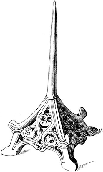 Ein horizontal gegliederter Ring leitet in den etwas engeren cylindrischen Ständer über, der in der Mitte durch einen Knauf unterbrochen ist. Die zwei Cylindertheile des Stieles sind graviert und tragen in Majuskelbuchstaben die Inschriften oben: ✠ AVE MA. unten: RIA GRA. Der Knauf ist glatt und besteht aus zwei flachen, aufeinander gelegten Kugelabschnitten. Aus dem Rande treten sechs vierpaßförmige Cylinder heraus, die an der Stirnseite sechs gravierte, mit durchsichtigem Schmelz überzogene Plättchen zeigen, auf denen sich ein Christuskopf, ein in Halbprofil gestellter bärtiger Kopf und die Zeichen der vier Evangelisten befinden. Die Thierfiguren sind zwar ihrer Kleinheit wegen nur eben angedeutet, aber in wenigen Linien sehr charakteristisch stilisiert, während sowohl die Köpfe am Knaufe, als die Figuren der Medaillons am Fuße ziemlich handwerksmäßig graviert sind.