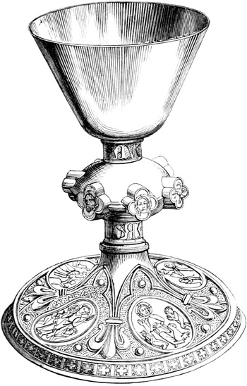 Der Kelch (Fig. 1, s. Sp. 3) ist von Silber und vergoldet, mit getriebenem Fuß und Knaufe und an beiden Theilen mit emaillierten Silberplättchen belegt. Er hat eine Höhe von 17 Centim. Der Fuß ist rund, hat einen untern Durchmesser von 12,5 Centim. und zeigt einen niederen Anlauf, auf welchem sich getriebene Vierpässe in einer Reihe kleiner viereckiger Felder befinden. Am Fuße, der sich in elegant geschwungener Linie nach oben verengt, sind vier spitzbogige Wulste getrieben, unter denen je ein zweiter Wulst die Nasen zu den Spitzbogen bildet. Die Enden der Spitzbogen stoßen gegen vier abwärts gekehrte, stark hervorgetriebene Lilien. Unter jedem Spitzbogen ist ein Rundmedaillon hervorgetrieben und in demselben ein aufgelegtes Silberplättchen, das, ganz flach modelliert, je drei Figuren zeigt. Diese Medaillons waren ehemals gänzlich mit durchsichtigem Schmelz überzogen, der jedoch jetzt sehr stark beschädigt ist, so daß sich die Art der flachen Modellierung, die nicht durch Treiben, sondern durch Gravierung entstanden ist, sehr deutlich zeigt. Die Scene eines Medaillons stellt den sitzenden und segnenden Heiland dar, zu dessen Seiten Mann und Frau (die Donatoren) knieen. Der Grund des Medaillons war blau, der Mantel des Heilandes grün, das Untergewand violett. Das folgende Medaillon zeigt Maria mit dem Kinde sitzend; zu beiden Seiten dieselben Donatoren. Die Farben der Maria sind die gleichen, wie bei Christus; das Kleid der Donatorin ist gelb. Die zwei andern Medaillons zeigen den heiligen Nicolaus und die heilige Katharina stehend; zur Seite wiederum dieselben Donatoren, die sich also viermal finden. Die Farben sind auch die nämlichen. Je drei stark perlenartig hervorgetriebene Punkte füllen die Räume zwischen Medaillons und Maßwerk aus. Der Grund ist durch eingeschlagene Bunzen aufgerauht.
