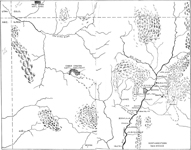 My grateful acknowledgements are due to Dr. H. P. Mera and Mr. Stanley Stubbs of the Laboratory of Anthropology, Santa Fe, for their expert advice and criticism in their respective fields; Dr. Leslie Spier, Professor of Anthropology, University of New Mexico, for his helpful suggestions; the late Professor Lansing B. Bloom, Professor of History, University of New Mexico, for helpful information on history; Mrs. Evelyn C. Frey, Bandelier National Monument; Mrs. M. H. Sharp, for the many hours she gave to patient listening and constructive suggestion; Mr. Wayne Mauzy, Museum of New Mexico, for permission to use photographs and cuts; Mr. Natt Dodge, Region Three Office, National Park Service, for his helpful suggestions and time spent in obtaining cuts; my Mother, Mrs. J. H. Hendron, for her encouragement and assistance; and to all others who rendered services.