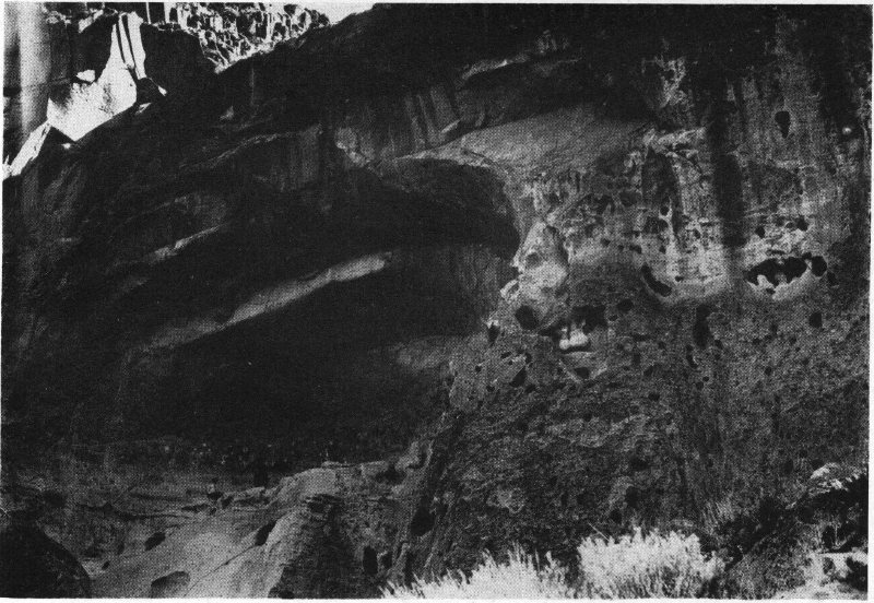 The Indians of Tyuonyi during the Great Period had developed the dwellings in the north cliff extensively to the number of some three hundred caves. There might have been twice as many talus houses to the front, some one story and others two and three stories high. The cliff population centered around the Long House while other groups built houses in different locations at the base of the north cliff. And still other groups built the big community apartment house of about four hundred rooms to a height of possibly three stories and called it “Puwige” or “pueblo where the Indian women scraped the bottoms of the pottery vessels clean.” And they built it in the form of a fort with a narrow hallway through the east side as the only means of entrance. And here they fortified themselves during times of attack 54 by other Indians like themselves who might have been jealous of the watered Valley of the Frijoles. Another group preferred to remove themselves down the Canyon a quarter-mile and they erected a circular pueblo, a miniature of Puwige, seemingly. Still another group preferred to be more isolated and so they chose a deep cave one hundred fifty feet above the Canyon floor in which to build their house and kiva.