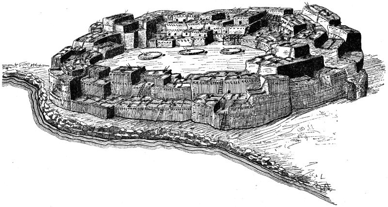 In the center of the valley, seemingly equidistant from both sides, was a huge circular house comprised of many small rooms, one on top of another, with tiny ladders extending from the ground to the roofs. Indians were going in and out of small roof openings. Their house was a veritable fort of primitive style. Four hundred rooms, or more, were built in the form of a circle. The structure had an opening or hallway through one side which led to an inner court or plaza. A sentry was stationed inside the entrance which was a high, thick wall built in the shape of a semi-circle with a narrow opening. A lone Indian, or maybe two, with bow and arrow in hand, might have been seen carrying a deer down a narrow trail. Queer looking creatures were these Indians with long stringy hair tied down by a band around their foreheads. They wore moccasins of deer skin on their feet. Kilts covered their thighs. They could have been a short muscular sort of people much the same as our modern pueblo dwellers. But they were known as the “pygmies” or “the little strong people.”