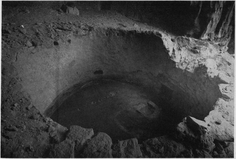 The five pits in the floor, which have been mentioned before, were apparently no longer needed for they were filled in with dirt and stones tightly packed. A thin layer of dirt was thrown over the entire floor surface. Kiva floors are 52 generally plastered over and during this period of occupation the Tyuonyi women, more than likely, were the ones who smeared four fine coats of adobe over the floor and smoothed it out with their hands.