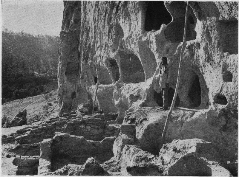 It has been said that Bandelier lived in the caves of the Rito de Los Frijoles, and, according to stories passed around by hearsay, he could have lived in a dozen different caves. It would be nice, and perhaps poetic, to say that the famous student hung his coat or his hat on such and such a nail, when wire nails such as are found in these caves probably did not exist during Bandelier’s visits to the Canyon. The general opinion among people who remember Bandelier is that he did spend some time in one particular cave high above the Canyon floor. It was a double-chambered cave overlooking Puwige and the entire broad and open lower end of the Canyon. The view was perfect. It might have been here that Bandelier organized some of his notes which resulted in the never-to-be-forgotten ethno-historic novel, 80 The Delight Makers. People have said that Adolph Bandelier lived for years at Frijoles, but this is not true. His investigation of practically the entire Southwest took only five years to complete. So we might limit his stay to days, but those days counted. It was Bandelier’s intent to portray history and archæology in the guise of fiction and here he laid the basis for his famous novel which brought fifteenth-century dwellers of the Tyuonyi to life again.