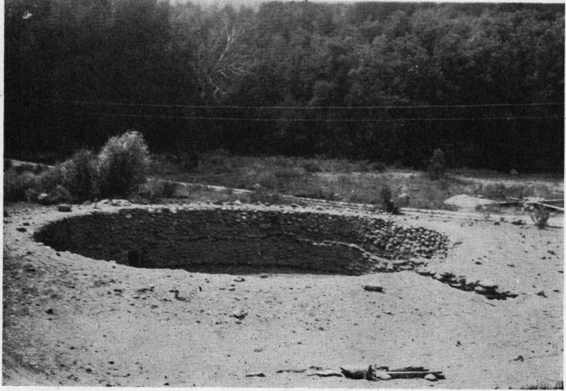 If the dual system was in vogue at Tyuonyi, there must have been two kivas to support it. A peculiar thing, it seems, took place here. At least one tribal kiva was built and 48 was in use before the Great Period of occupation came along. It was a large structure forty-two feet in diameter. Sixty Indians could have crouched down around the inside against the wall. Indian men, years before, excavated a large concave depression in the side of a hill a hundred yards or so down the Canyon from Puwige. Days and days were required to bring in thousands of cobble stones. They labored untiringly. They brought them from the river and they brought chunks from the cliff. Around this deep concave depression which they had laboriously scooped out of the earth with broken pieces of pottery, sticks, flat stones and whatever else they had to work with, Indian men laid stone after stone of this volcanic tuff in crude mortar. They laid a wall ten feet thick. It required thousands of the unworked stones to line this deep pit. It was a circular affair and was their way of creating a semi-subterranean chamber when they did not know how to lay single thickness masonry walls with fashioned blocks.