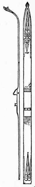 [1] Skees are a kind of snowshoe, four to six feet long, bent upward in front, with a band to attach it to the foot in the middle.