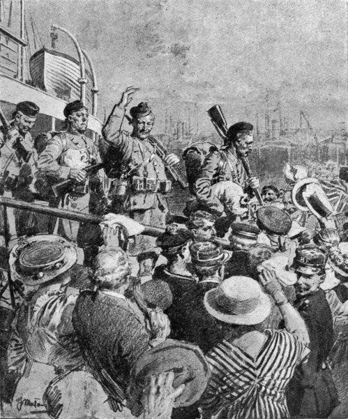 But immediately after our declaration of war on August 4th, a strange secrecy and silence fell like an impenetrable mask over all our military movements. In our cities and towns we were troubled with business disorganisations, but that mystery, that waiting in suspense, troubled us far more. News came that the fighting continued furiously on the Belgian frontier; that it was beginning on the fringes of Alsace; that the Russians were advancing victoriously on East Prussia; and still though our own army was mobilised and we were eagerly starting to raise a new and a larger one, we rightly learned no more, perhaps less, than the enemy could of what our Expeditionary Force was doing or where it was. Last time we were at war we had18 seen regiment after regiment go off with bands playing and with cheering multitudes lining the roads as they passed; this time we had no glimpse of their going; did not know when they went, or so much as whether they were gone. One day rumour landed them safely in France or Belgium; the next it assured us that they were not yet ready to embark; and the next it had rushed them, as by magic, right across Belgium and credited them with standing shoulder to shoulder in the fighting line with the magnificent defenders of Liège. But the glory of that defence, as we were soon to find out, belongs to Belgium alone; the Germans had hacked their way through and were nearing Mons before our men were able to get far enough north to come in touch with them. Not that they had lost any time on the road. It took a fortnight to mobilise and equip them; they sailed from Southampton on August 17th, and four days later were at Mons and under fire. This much and more you may gather from a diary-letter that was published in the Western Daily Press: