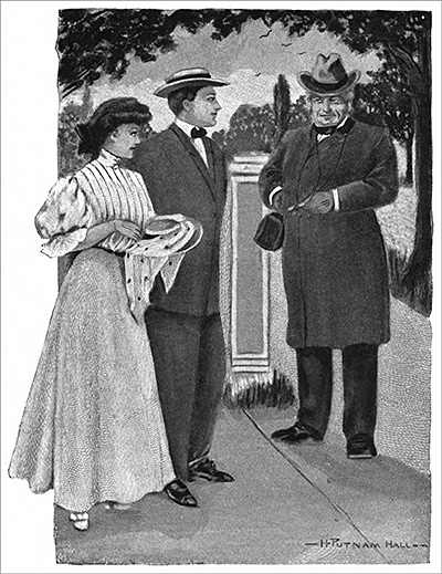 210 But then a disagreeable accident happened. A commercial traveller, dressed in a loud checked suit, dashed out of a door of the depot in the direction of the train and ran plump against Mr. Jordan, almost knocking that gentleman down and sending his newspaper bundle flying several yards away. The blundering fellow actually tumbled down, and in struggling to rise caught Mr. Jordan around the knees and held him so fast that he could not move.