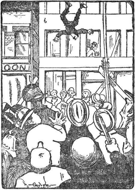 I could stand the suspense no longer. I opened my eyes, but all seemed blurred before them. “Is he dead?” I asked of a man standing by my side. “No; he’s all right,” the man answered. “But he fell, didn’t he?” I cried. “O, yes, he fell all right,” he said; “but he landed on a bunch of rubber-necks and bounced back on the scaffold again.”