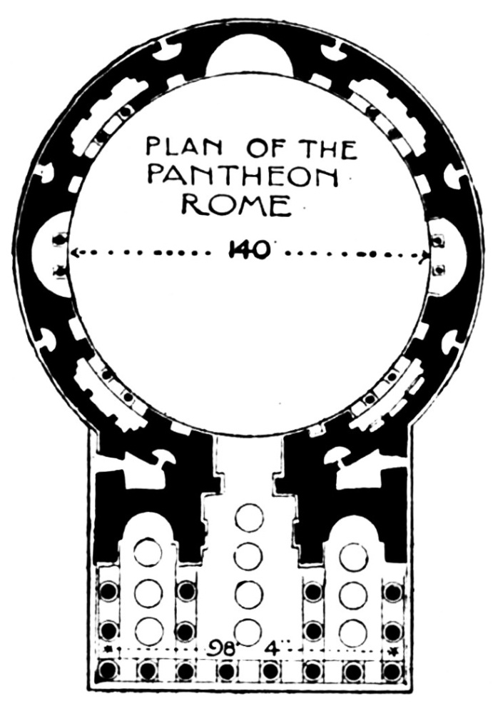 The IONIC order has columns of from 9 to 9½ diameters in height, with 24 flutings divided by narrow fillets; the base is half a diameter in height and composed of a plinth, torus, fillet, cavetto, fillet, torus, and fillet. The Capital is 7/10 of a diameter high and consists of a pair of double scrolls or volutes, supported by an echinus moulding enriched with the egg and tongue, with an astragal below.