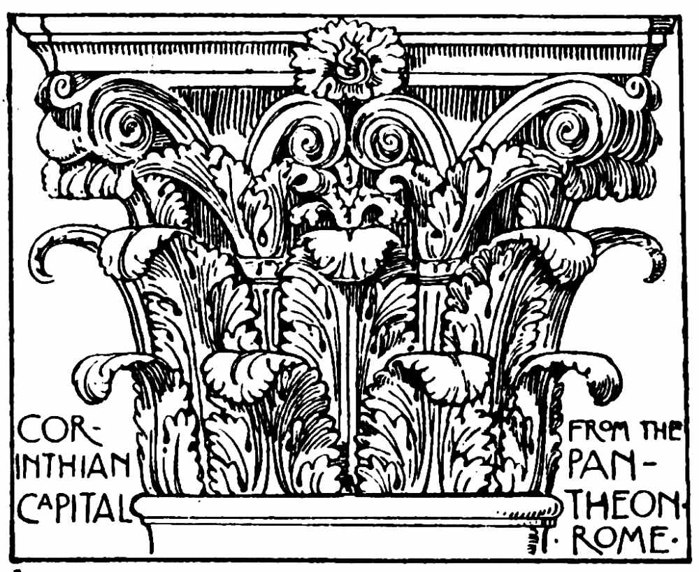 The CORINTHIAN order was not much used by the Greeks; the examples however show considerable refinement and delicacy of details. The Columns are 10 diameters in height with 24 flutings; the Base is ½ diameter high; the Capital is a little greater than a diameter in height and is enriched with acanthus foliations and spiral volutes. The Entablature is richer; and the Cornice deeper and more elaborate than those of the other orders.