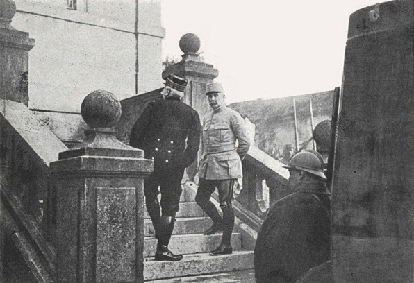 Taking over the command on the night of the 25th, General Pétain at once divided the battle-line into four sectors, officered as follows: General Bazelaire, on the left bank, from Avocourt to the river; General Guillaumat, from the Meuse to Douaumont; General Balfourier, from this point to the Woevre; General Duchesne, on the Meuse Heights.