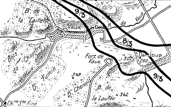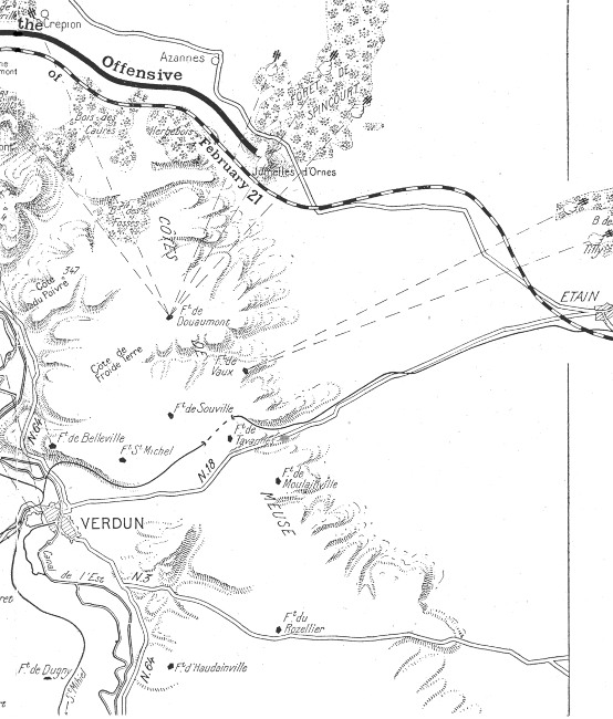 On the 25th, the 37th I.D., with orders to defend Talou Hill and Louvemont village, resisted for a long time against incredibly furious attacks, but on their right the enemy succeeded in capturing Vauche [Pg 12] Wood and, advancing towards Douaumont, carried the fort by surprise. However, their efforts to take the village failed before the heroic tenacity of the 31st Brigade, while the 94th D.I. covered itself with glory. The enemy advance from this side, had the effect of compelling the 31st I.D. to abandon Talou Hill. During this time the line in Woevre was, unknown to the Germans, voluntarily withdrawn to the foot of the Meuse hills, where the French only retained outposts at Fresnes and Manheulles.