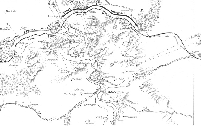 The Germans, who had fourteen railways at their disposal, and who, during a long and careful preparation, had concentrated seven army corps and extraordinarily powerful artillery, comprising at least 3,000 guns of all calibres, attacked the French, who had a river in their rear and whose one solitary broad-gauge railway was under enemy gun-fire. By sacrificing men and material on a lavish scale the enemy counted on rapidly overcoming all obstacles, level the French trenches, crush the centres of resistance under a deluge of 17-inch, 15-inch and 12-inch shells, isolate them with barrage fire from 8-inch guns and poison-gas shells, [Pg 9] and occupy the destroyed positions—such were to be the German tactics. They were so sure, by repeated smashing blows, of breaking through between Bras and Douaumont, and, by their attack on Verdun, of forcing the French to withdraw their wings, that they neglected first to attack the French positions on the left bank and in the Woevre plain, with the result that their colossal effort broke down before the tenacious resistance and heroism of the French.