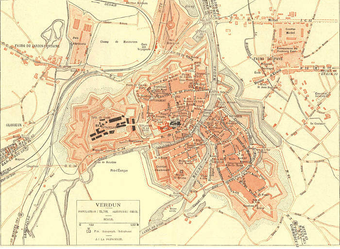 Both in respect of its geographical position and history, Verdun is a typical fortified town. From time immemorial it has played an important part in resisting invasion, as witness its fortified camp and citadel. Since 1870 it has been the centre of an essential position formed by a rough hemi-cycle of hills and slopes bristling with defensive works and batteries.