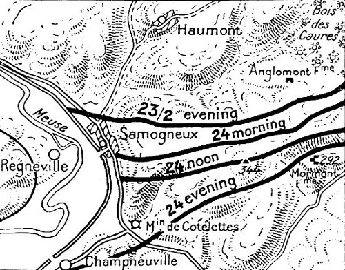 In the evening the front extended along the Samogneux—Beaumont—Ornes line. Samogneux was captured by the enemy during the night. The situation was very critical.