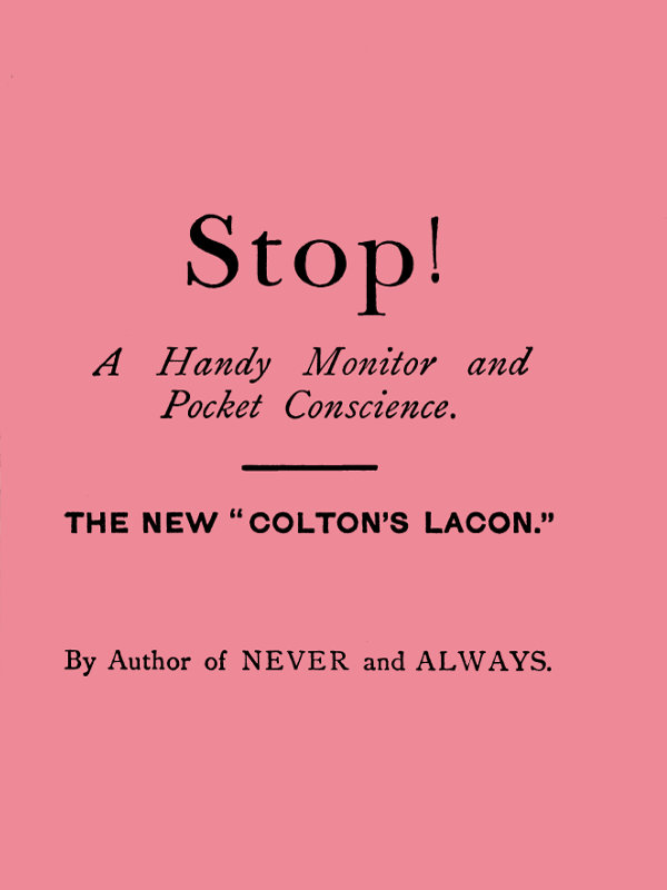 In “Never” and “Always,” his appeal was rather to the externalities of life. In “Stop,” his aim is to regulate the very springs of impulse, deliberation and resolve. In other 4 words, there is not a temptation that he would not strip of its disguise, not an unworthy motive that he would not pulverize as with a corrective club, not a misleading conceit that he would not skewer to its squirming source.