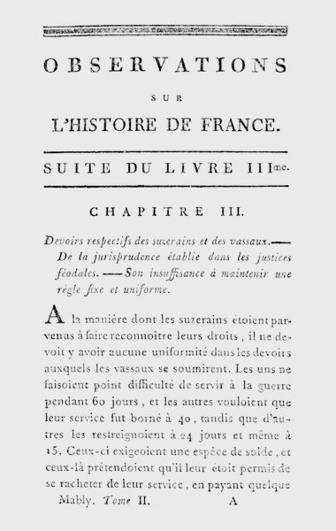 Un seigneur n’avoit d’autorité que sur ses vassaux immédiats. Ses arrière-vassaux ne lui prêtant ni la foi ni l’hommage, ne lui devoient rien, et ne reconnoissoient en aucune manière sa supériorité, parce que la foi donnée et reçue étoit le seul lien de la subordination, et l’hommage, le seul principe du droit politique. Lorsqu’on possédoit plusieurs seigneuries, on ne pouvoit exiger le service que des vassaux qui relevoient de la terre même pour laquelle on faisoit la guerre. Si les Capétiens, par exemple, avoient eu le droit, en qualité de rois, de convoquer et d’armer les vassaux de la couronne pour les querelles particulières qu’ils avoient, comme ducs de France, comtes de Paris et d’Orléans, ou seigneurs de quelque autre fief moins considérable, ils n’auroient jamais eu de guerre qu’ils n’eussent conduit contre leurs ennemis les plus foibles, les seigneurs les plus puissans du royaume. Les fiefs d’un ordre inférieur auroient été bientôt détruits, l’économie du gouvernement féodal auroit été renversée; et toutes les forces du 8 royaume se trouvant entre les mains des possesseurs des plus grands fiefs, il se seroit élevé une ou plusieurs monarchies indépendantes.