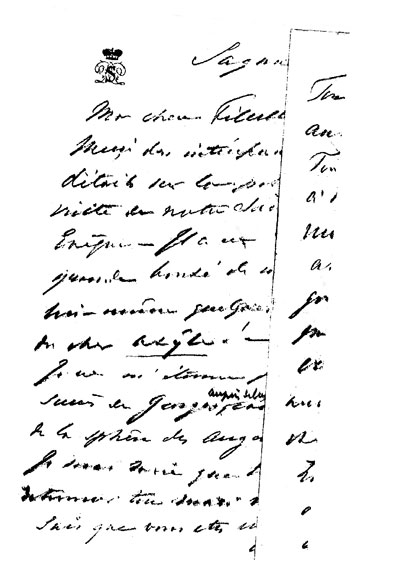 Sagan, 6 mai 1851.—Je n'entreprendrai pas mon 14 voyage in good condition ni in good spirits. Je ne sais trop où je vais, je me sentirai seule et destitude [13]. Comme ce n'est ni par légèreté, ni par goût de changement ou futilité, mais bien pour accomplir un devoir de haute convenance, que je m'engage dans cette route, je veux espérer qu'elle ne me sera pas fatale.