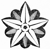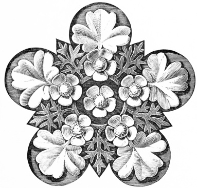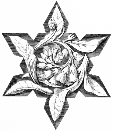 Symmetry shows itself in a general beauty of proportion, and balance of masses in a composition; or, in the more limited sense in which we now use the word, in the likeness of one half or part to another in the unit of design. We speak of a design being bi-symmetrical or tri-symmetrical, or if it goes beyond this, as in snow crystals and in many other cases where the ornament may be bounded by a circle, it is termed multi-symmetrical. Bi-symmetrical arrangements will be found most appropriate for the decoration of upright surfaces, as wall-papers or curtains, which will always be seen one way, while multi-symmetrical star-like forms are more suitable for floor-cloth or carpet patterns, because{x} a star-like pattern on the floor looks equally well from all parts of the room; while a design having its halves merely alike can only be viewed to advantage from one point. It is curious to observe that in Nature the rule seems to be that the lower forms shall be multi-symmetrical, made up of several similar parts, while the higher forms of life are bi-symmetrical: thus in the first class we get snow crystals, sea-anemones, star-fishes; and in the second, the more advanced forms of animal life—insects, birds, quadrupeds, and man himself. There are numerous exceptions, however, to this: thus we have flowers multi-symmetrical, and their leaves only alike in their halves, though undoubtedly the flower, in view of its functions in vegetable physiology, and also from the ornamentist’s stand-point, cannot be considered lower in the scale of creation than the leaf. The charm produced by the mere repetition of parts may be well seen in the kaleidoscope, where a series of irregular pieces of glass develop into various ornamental forms, owing to their symmetrical arrangement and radiation from one centre—an effect still more clearly and beautifully seen in the crystals of snow, where the unit is itself of pleasing form.