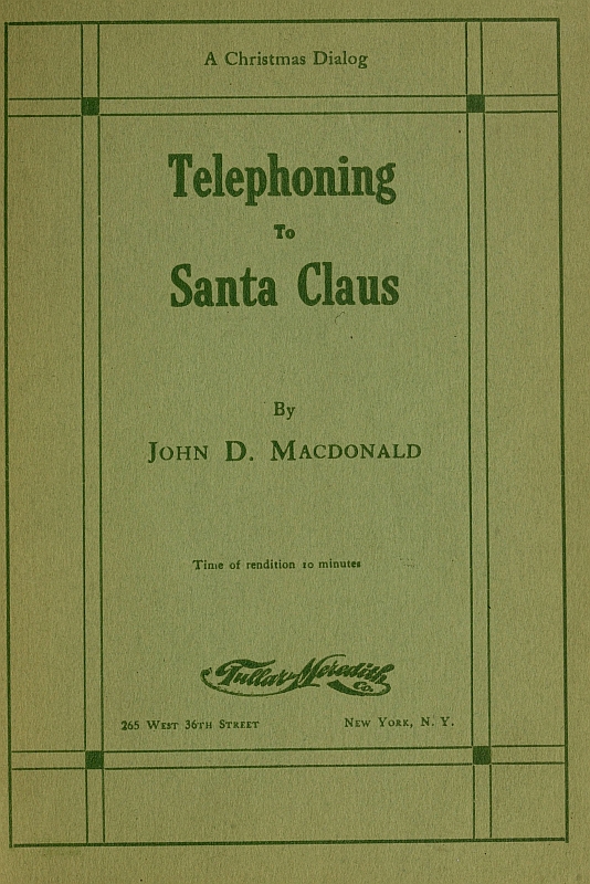 TELEPHONING TO SANTA CLAUS. A Christmas dialogue for two (2) girls, ten (10) or twelve (12) years of age, who conceive the idea of using the telephone to tell Santa Claus what they most want, and suffer no great surprise when the very things asked for reach them through the “phone.” A simple sitting-room scene in which a make-believe “phone” is installed furnishes the setting. Time of rendition about 10 minutes. Price 25 cts., postpaid.