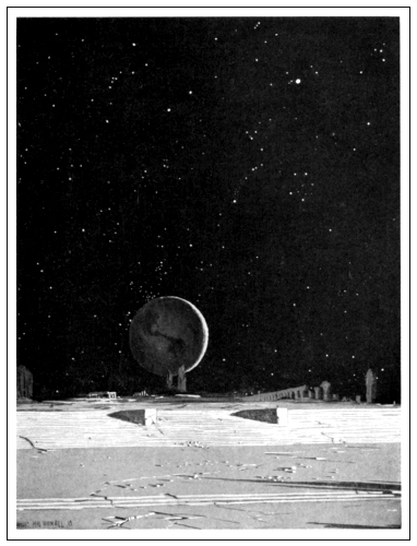 The story was simply told. He started at night for the red planet. He got there and he landed. The air seemed much like ours. But he found himself in a world quite different from his own. All was architecture; temples, towers and enormous viaducts fading away into the horizon, as far as the eye could see. And everything was tall and slender. The trees were very high with branches pointing upward like poplars, and always formally laid out in avenues, or in geometric patterns. And the color! It was like looking at an endless city through orange glasses. The few people he saw had larger heads than ours, more like children, but like children with very short legs. They were surprisingly light on their feet. He was surprised at their high jumps until he remembered that a man who weighs two hundred pounds on the earth weighs but seventy-five pounds on Mars. He really saw but little, however, for although he had tested the atmosphere he[296] found, after looking about him a moment, that the air, while pleasant enough to breath, was affecting his nerves and brain, almost like laughing gas. Then, as he stood there, and began to realize his danger, the wonderful thing happened!