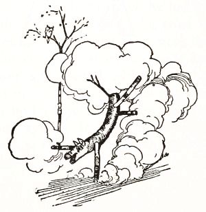 So he took his axe to the forest, and selected some stout, straight saplings, which he cut down and trimmed of all their twigs and leaves. From these he would make the arms, and legs, and feet of his man. For the body he stripped a sheet of thick[Pg 5] bark from around a big tree, and with much labor fashioned it into a cylinder of about the right size, pinning the edges together with wooden pegs. Then, whistling happily as he worked, he carefully jointed the limbs and fastened them to the body with pegs whittled into shape with his knife.