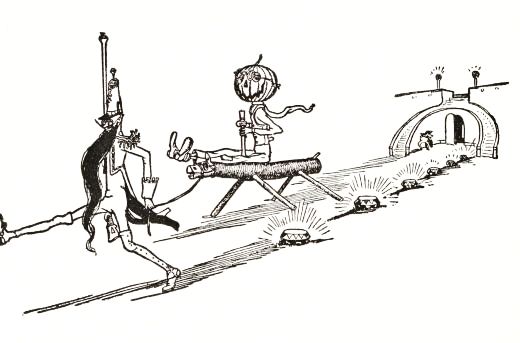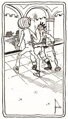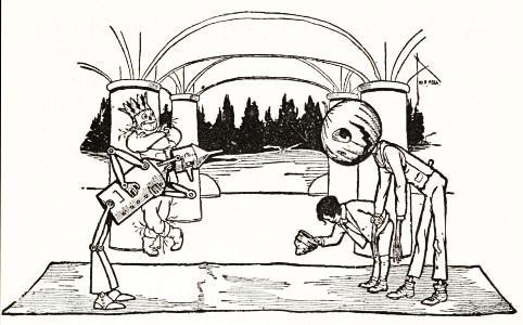 "Jack's all right, and works fine!" he said to himself, panting with the unusual exertion. But just then he discovered the man's left arm had fallen off in the journey; so he went back to find it, and afterward, by whittling a new and stouter pin for the shoulder-joint, he repaired the injury so successfully that the arm was stronger than before. Tip also noticed that Jack's pumpkin head had twisted around until it faced his back; but this was easily remedied. When, at last, the man was set up facing the turn in the path where old Mombi was to appear, he looked natural enough to be a fair imitation of a Gillikin farmer,—and unnatural enough to startle anyone that came on him unawares.